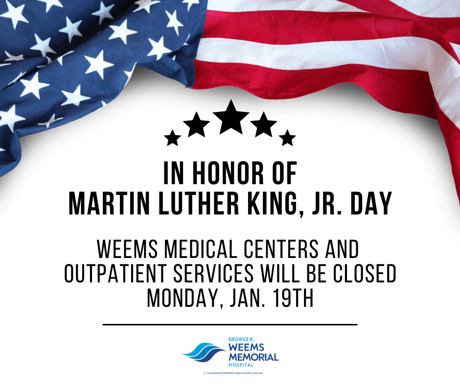 In observance of Martin Luther King Jr. Day, Weems Memorial Hospital will close Weems Medical Center East, Weems Medical Center West, and all outpatient services on Monday, January 19.